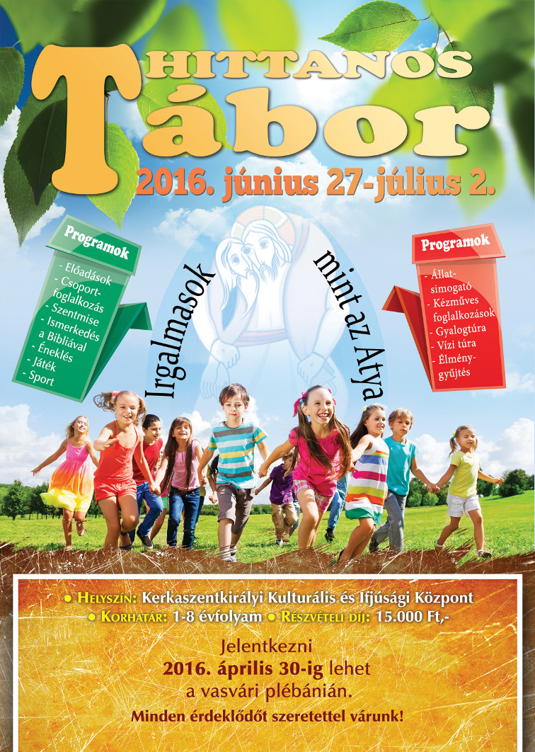 Hittan tábort szervezünk Kerkaszentkirályra 1-8. évfolyamosok számára június 27-étől július 2-áig. Részvételi díj: 15 000 Ft, jelentkezni április 30-áig lehet a hivatalban vagy a sekrestyében.