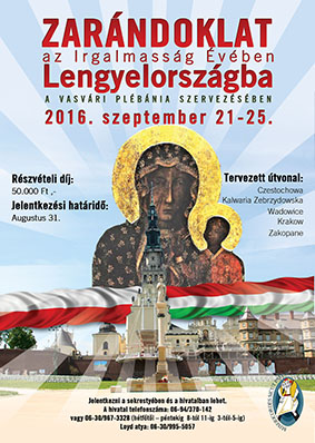 Az Irgalmasság éve keretében zarándoklatot szervezünk 2016. szeptember 21-25-ig Lengyelországba, melynek költsége 50.000Ft . Jelentkezni augusztus 31-éig a sekrestyében vagy a hivatalban lehet. Letölthető plakát.