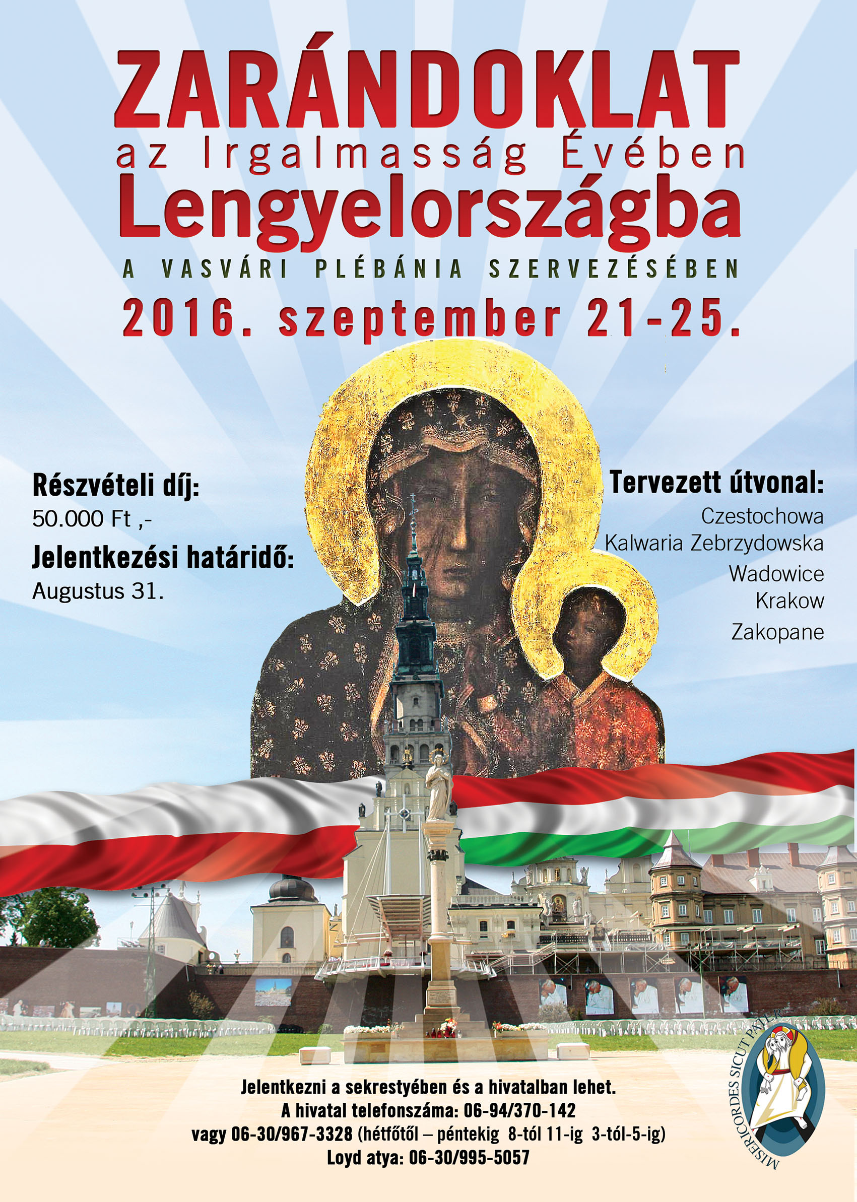 Az Irgalmasság éve keretében zarándoklatot szervezünk 2016. szeptember 21-25-ig Lengyelországba, melynek költsége 50.000 Ft . Jelentkezni július 31.-éig a sekrestyében vagy a hivatalban lehet. További információ a hirdetőtáblán olvasható.