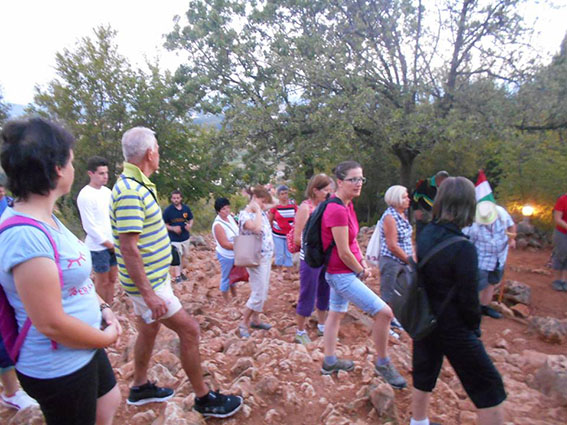 Egyik reggel, sőt inkább hajnalban, mert sötétben indultunk el, felmentünk a jelenések hegyére, ahol Mária mind a mai napig meg szokott jelenni a látnokoknak. Útközben rózsafüzért imádkoztunk. Nehéz talajon, sziklákon kellett menni, de volt a csoportunkban két fi atal, akik mezítláb mentek fel a hegy tetejére.