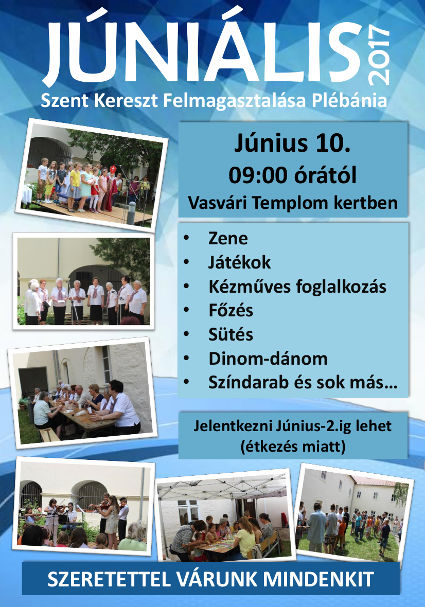 Június 10-ére, szombatra juniálist szervezünk itt a vasvári plébánián. Jelentkezni június 2-áig lehet a sekrestyében és a hivatalban. Mindenkit szeretettel hívunk és várunk!!!